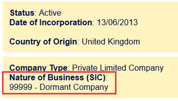 有些银行如果发现你的公司Nature of business (SIC) 是99999 - Dormant Company(即休眠状态),如下图,会暂停你的账户,甚至冻结或注销您的账户,这种情况,需要尽快变更公司的业务性质(即经营范围),变更后就不会显示为休眠公司了。需要变更的可以联系我司,极速办理。